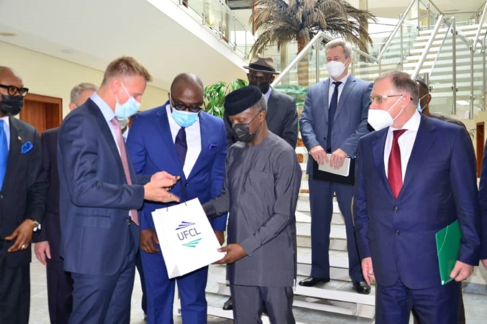 On the photo: UFCL Marketing Director, Maksim Poltoradnev, introduces group of companies to Vice President of Nigeria, Yemi Osinbajo. At the end of September the delegation of Russian businessmen in the lead of Ambassador-at-large, Head of the Secretariat of the Russia-Africa Partnership Forum, Oleg Ozerov, organized by Association of Economic Cooperation with African States with support of the Embassy of Russian Federation in Nigeria visited Nigeria to meet local partners. Among other companies, that attended the event, UFCL arouses particular interest in the light of opening representative office and thus expanding its operations in Nigeria.